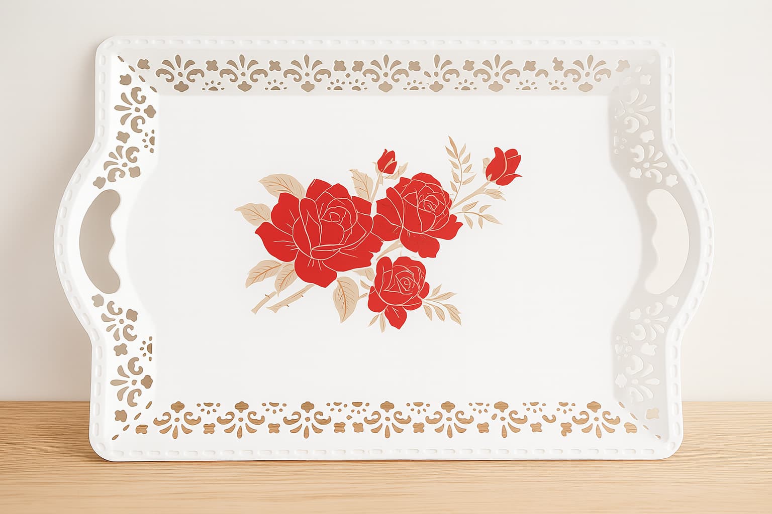 Fuente blanca con diseño de flor roja, perfecta para mesa.